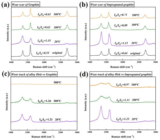 From 20 °C to 300 °C, the ID/IG values of the wear surfaces of the two types of graphite decrease significantly with the increase in temperature, indicating that high temperature friction strongly increases the degree of the wear surface structure, as shown in Figure 9a,b. The ID/IG values of the friction-transferred film on the disk specimen follows a trend similar to that of the graphite’s wear surface, as shown in Figure 9c,d. However, the difference is that the characteristic peaks on the disk specimen paired with the matrix graphite disappear at 500 °C, which means the graphitization declines. The evolution of the Raman characteristic peaks shows that, under the influence of friction shear stress and thermal stress, the structure of the wear surface and the friction-transferred film on the disk specimens of the two types of graphite tend to change from disordered to ordered with the increase in temperature. Consequently, the graphite wear surface and the friction-transferred film could slide more easily relative to each other [32], which is helpful for the reduction of the COF.