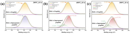 Figure 10 shows the O 1s fine spectra of the friction-transferred film on the disk specimen. For the disk paired with matrix graphite, the dominant chemical bond is C=O at 200 °C, 400 °C, and 500 °C, with a peak position of 531.5 eV [31,33,34]. For the disk paired with impregnated graphite, there is an extra C-O-P bond (532.9 eV), in addition to C=O bond (531.5 eV) [35,36,37], at 400 °C and 500 °C, which indicates that a high-temperature friction-induced chemical reaction between the phosphate and graphite occurred on the contact interface, in addition to the oxidation of graphite.