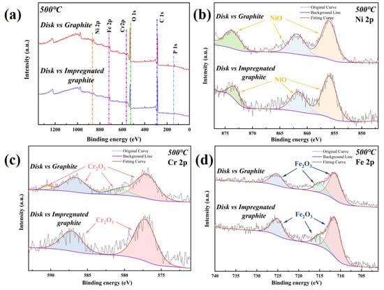 Figure 11 shows the full XPS spectra at 500 °C and the fine spectra of the Ni 2p, Cr 2p, and Fe 2p of the wear tracks of the counterpart disks at 500 °C. Figure 11a shows that the predominant elements on the wear tracks are C and O elements, with a small amount of metallic elements being oxidized. The Ni 2p spectrum could be decomposed into three main peaks at 857.2 eV, 861.4 eV, and 873.8 eV, all of which are NiO [38,39,40]. The fine spectrum of Cr 2p shows that the oxide is mainly Cr2O3, with peaks at 576.2 eV and 586 eV, and a small amount of CrO3, with a peak at 579.8 eV [39,41,42]. The fine spectrum of Fe 2p has three main fitted peaks at 710.7 eV, 713.3 eV, and 725.2 eV, respectively, with the corresponding oxides being Fe2O3 [40,43,44,45]. The results of XPS show that the primary friction oxidation products are mainly composed of NiO, Cr2O3, and Fe2O3, which are mixed in the friction-transferred film.