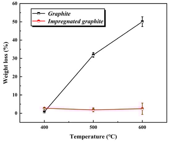 The weight loss results obtained are shown in Figure 12. Compared to the oxidation weight loss of the matrix graphite, which increases dramatically with the increase in temperature, the oxidation weight loss of the impregnated graphite at different temperatures is very small and relatively close, indicating an excellent and stable oxidation resistance for the impregnated graphite, especially at high temperatures.