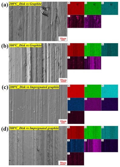 SEM micrograph and elemental distribution on the transfer film of two types of graphite: (a) 200 °C, disk vs. matrix graphite; (b) 500 °C, disk vs. matrix graphite; (c) 200 °C, disk vs. impregnated graphite; (d) 500 °C, disk vs. impregnated graphite.