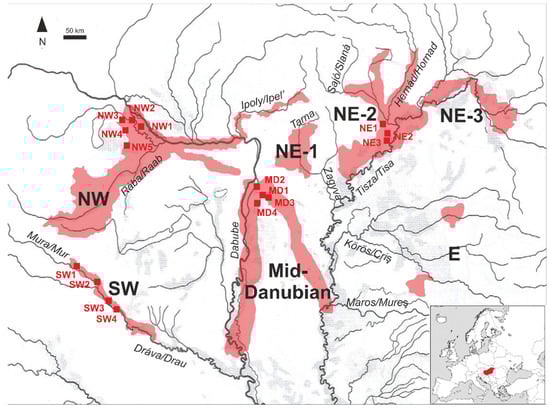 Major pebble mining regions in Hungary with the indication of samples studied in this paper: NW-Hungarian Region (upper section of river Danube and the valley of river Rába); Mid-Danubian Region (middle section of river Danube); SW-Hungarian Region (riverbed of river Dráva); NE-1 Region (alluvial cone of brook Tarna in the foreground of Mátra Mts.); NE-2 Region (alluvial cone of rivers Sajó-Hernád in the foreground of Bükk Mts.); NE-3 Region (alluvial Szatmár-Bereg plain of river Tisza); E Region (terraces of rivers Szamos, Kőrös, and Maros). The source of the hydrographic map of the Carpathian basin: http://pctrs.network.hu/clubpicture/1/3/_/karpat_medence_vakterkep_terkep_2_103364_22555.png, (accessed on 15 January 2023). The alluvial cone of rivers Sajó-Hernád in the southern foreground of the Bükk Mountains serves the largest pebble quarries of Hungary (NE-2 Region, mentioned later as NEHR, see Figure 1, e.g., Alsózsolca, Nyékládháza). The thickness of the clastic formation can even reach 100 m. The lithological composition is driven by the erosional area of rivers Sajó, Bódva, and Hernád which originate in the Low Tatras, the Slovak Ore Mountains, and the Gemer-Turňa Karst. Those are composed of granitoids and other crystalline formations of the Gemericum Unit [], metaophiolites of the Meliaticum Unit [,], and carbonatic rocks of the Silicicum Unit [,,].