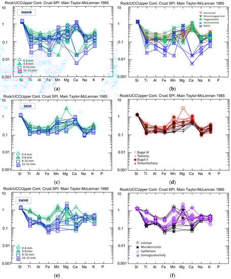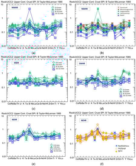 The trace-element distribution, relative to the upper continental crust (UCC) average [], in the NWHR, MDR, SHWR, and NEHR, by grain size (a,c–e) and by the different mines in the case of the NWHR (b) and the NEHR (f).