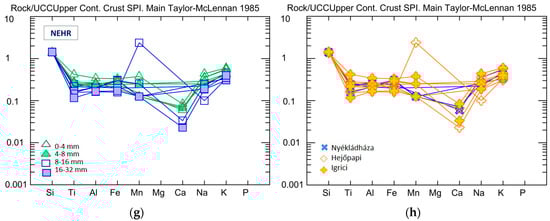 At the NEHR, the SiO2 content is between 89 m% and 95 m%. The other major elements show a lower degree of variability and depletion (Figure 2g,h), just like those in the MDR. There are no MgO data for these samples as the concentration was below the detection limit; in addition, their CaO contents are also very low. Slight enrichment of all major oxides is visible in the 0–4 mm fraction compared to other grain-size fractions. However, there is no correlation between the localities and element distributions Figure 2h.