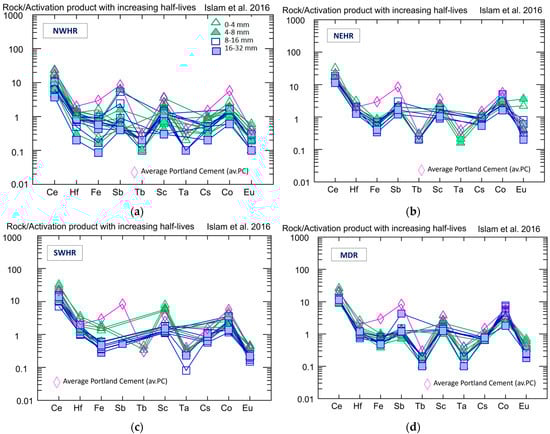 The SWHR is where these elements show enrichment in the 0–4 mm samples (Figure 4c) compared to other grain-size fractions, but in most of the cases, these are below the average for the Portland cement, except for Ce, Hf, and Sc, where they are slightly above. MDR shows little variation in the concentration of the listed long-lived isotopes (Figure 4d), and all data are below the average for the Portland cement, except for the Eu in the 0–4 mm grain size.