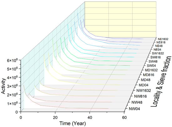 Based on the micro- and macro-element compositions, the decay or cooling of aged gravel and sand samples, as potential constituents of concrete, can be modelled. The decay over a 60-year timespan can be followed on the graphs by regions, quarries, and sieve fractions (Figure 5). To illustrate the long-term decay trends, we present the cumulative activities of the four most relevant long-lived isotopes that we can measure: 60Co, 134Cs, and 152,154Eu. These active nuclides are produced from elements Fe, Co, Cs, Sm, and Eu.