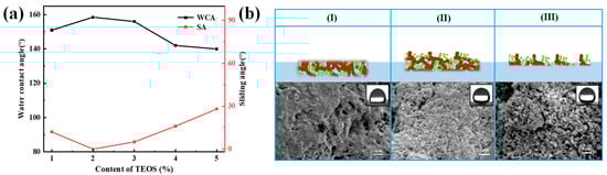 The SiO2 content is 0.8 wt.%. (a) WCAs and SAs of the HD-SiO2/SiO2 Sol@PDMS coatings prepared at different TEOS contents; (b) dispersion patterns and SEM images in different PDMS: (I) 5 wt.%, (II) 2 wt.%, (III) 1 wt.%.