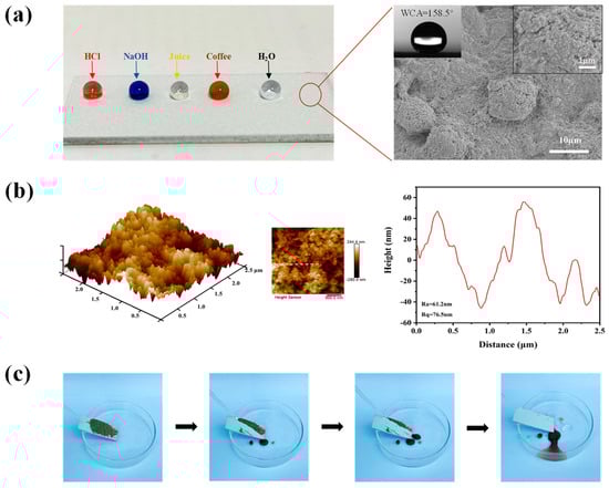 The HD-SiO2/SiO2 Sol@PDMS superhydrophobic coating shown in (a) digital photographs of different droplets and SEM images, (b) AFM surface morphology and 3D images and profiles, and (c) photographs of self-cleaning tests.