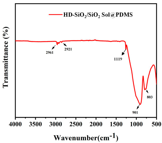 FT-IR was applied to analyze the chemical composition of HD-SiO2/SiO2 Sol@PDMS superhydrophobic coating. As shown in Figure 4, there are two characteristic vibrational peaks at 803 and 902 cm−1, which can be attributed to the anti-symmetric stretching vibration of Si-O-Si and the networked Si-O-Si symmetric bond stretching vibration in the coating [42]. The successful binding of the nano-silica to the acid-catalyzed silica precursors formed a networked silica structure. The characteristic peak at 1119 cm−1 in the figure is the absorption peak of the Si-C bond. Further, two characteristic peaks at 2961 and 2921 cm−1 were also observed, which could be attributed to bending and telescopic vibrations of aliphatic-CH2 associated with the PDMS contained in the coating as well as the hydrophobic modifier HDTMS [43]. The presence of these peaks, when compared to the infrared spectrogram in Figure S1, further confirms the successful preparation of the HD-SiO2/SiO2 Sol@PDMS superhydrophobic coating.