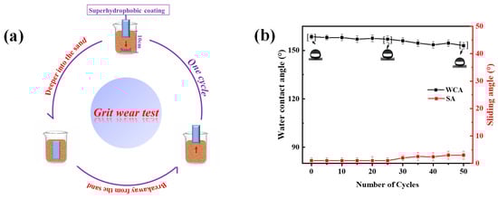 The mechanical durability of superhydrophobic coating is a key focus in practical applications. Hierarchical micro/nanostructures have a tendency to lose their superhydrophobic performance when subjected to mechanical friction. Hence, grit abrasion testing was conducted on the HD-SiO2/SiO2 Sol@PDMS coating to evaluate the mechanical durability. Figure 5a illustrates the procedure of immersing the coating in a beaker containing standard sand followed by its removal to constitute a single wear cycle. Note that a force is applied to the coating here to complete a cycle at a speed of 20 cm/s. The WCA and SA of the coatings were measured after five wear cycles. Figure 5b displays the WCAs and SAs of the coating after grit abrasion testing. The results demonstrate WCAs decreased and SAs increased with increasing wear cycles; however, the WCA still remained above 150° after grit abrasion over 50 cycles. These results demonstrate that the HD-SiO2/SiO2 Sol@PDMS coating has good wear resistance. Subsequently, the strength and adhesion of the coating to the substrate were evaluated through water impact testing, measured at 200s intervals, as shown in Figure 5c. Obviously, the WCA of the HD-SiO2/SiO2 Sol@PDMS coating decreased from 158.5° to 151° under a water pressure shock of 200 KPa for 1200 s and still remained superhydrophobic.