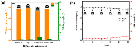 (a) WCAs and SAs of the HD-SiO2/SiO2 Sol@PDMS superhydrophobic coating after 24 h immersion in 0.1 mol/L HCl, H2O, 0.1 mol/L NaOH, and 3.5 wt.% NaCl solution (b) Variation in WCAs and SAs after 30 days of outdoor exposure.