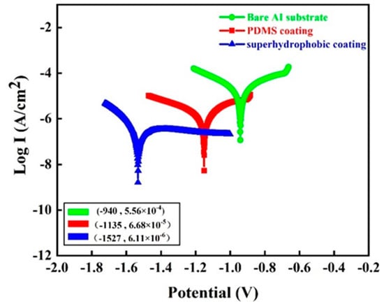 To investigate the ability of the HD-SiO2/SiO2 Sol@PDMS superhydrophobic coating to be applied to metal corrosion protection, electrochemical corrosion tests were performed on Al sheets that had been subjected to different surface treatments in 3.5 wt.% NaCl solution. As shown in Figure 7, the corrosion potentials were lowest for the superhydrophobic coated sample, followed by the PDMS coated sample, followed by the bare Al sheet sample. The electrochemical parameters including corrosion potential (E) and corrosion current density (I) for each sample obtained from the polarization curve fitting are shown in Table 1. The corrosion current density of the superhydrophobic coated sample was 6.11 × 10−7 A/cm−2, which was two orders of magnitude less than that of the bare Al sheet of 5.56 × 10−5 A/cm−2, demonstrating that the superhydrophobic coating significantly improved the corrosion resistance of the Al sheet. The corrosion efficiency (η) of the superhydrophobic coating sample relative to the original material could be calculated using Equation (1) [44].
