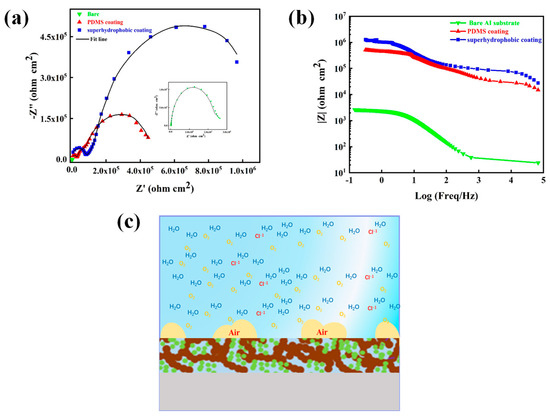 The chemical corrosion resistance of the samples was further evaluated by EIS, so as to reveal the detail of the metal corrosion process. The Nyquist and Bode plots of the three samples are given in Figure 8. The capacitive loop and impedance modulus of the superhydrophobic coated sample were much larger than those of the PDMS coated sample and the bare Al sheet sample, as can be obviously seen from the plots. The data obtained by fitting the circuit were consistent with the image display, and the coating resistance could be ranked in the following order: superhydrophobic coated sample > PDMS coated sample > Al sheet sample. In general, larger Nyquist rings have a higher charge transfer resistance, which indicates a lower corrosion efficiency [46]. Upon immersion of the Al sheet coated with prepared superhydrophobic surfaces into a corrosive solution, hierarchical micro/nanostructures on the superhydrophobic surface formed composite interfaces with the solution, wherein air was confined in the valleys among the hierarchical structures. The composite interfaces led to reduced contact area between the corrosive solution and the metal layer, thereby acting as a barrier against corrosion and hindering the transfer of electrons and ions between the substrate and the electrolyte (as depicted in Figure 8c). Therefore, the application of a superhydrophobic coating can provide an effective barrier coating for Al sheets.