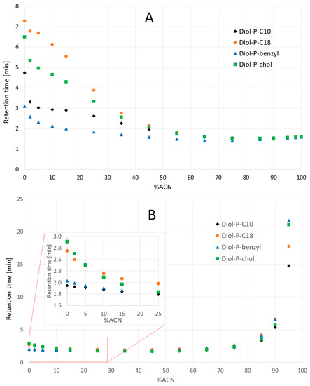 All separations have been made to the baseline. Due to the very weak interactions of the analytes with the mobile phase, there was significant peak tailing in each case. On the less hydrophobic phases—Diol-P-C10 and Diol-P-benzyl—the separation was completed in about 10 min; however, using the more hydrophobic phases—with an octadecyl chain or cholesterol molecule attached—significantly increases the analysis time.