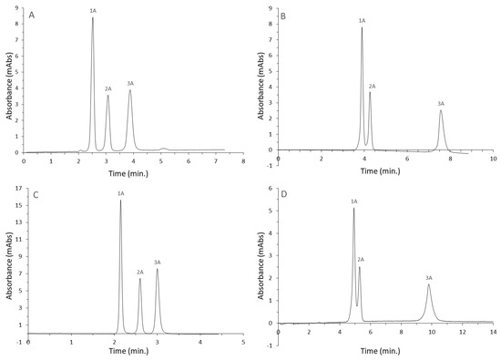 Separation of purine alkaloid in pure water on a series of chromatography columns: (A)—Diol-P-C10, (B)—Diol-P-C18, (C)—Diol-P-benzyl, (D)—Diol-P-chol, compounds: 1A—theophylline, 2A—theobromine, 3A—caffeine.