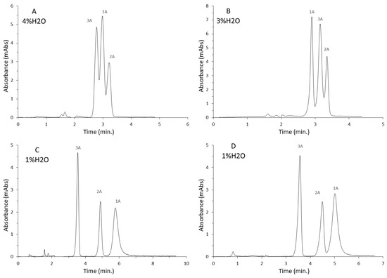Using the same columns and the purine alkaloid mixture, separating them in HILIC mode was possible. The optimal concentration of ACN/H2O was selected for each column. Chromatograms are shown in Figure 4.