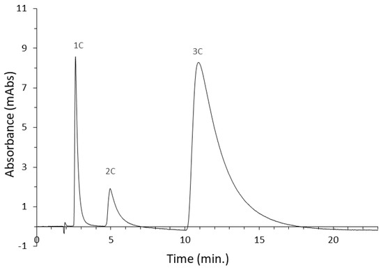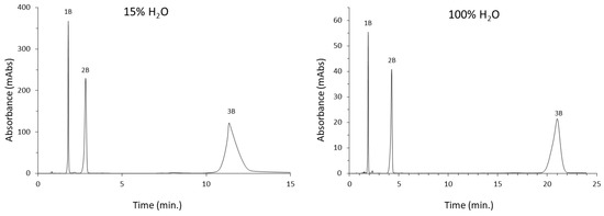 Only the Diol-P-benzyl column allowed the separation of the mixture to the baseline. It is the stationary phase with the lowest hydrophobicity. The differences in the structure of the caffeine derivatives include the different amounts and locations of the methyl group in the imidazolopyrimidine ring. Using phases with C10 and C18 chains attached did not allow the separation of either component to the baseline. In these two cases, it was necessary to use a higher water content than in the case of the Diol-P-benzyl and Diol-P-chol phases. This was due to the fact that the retention of the mixture’s components increased differently with a change in ACN concentration. At lower concentrations, the first two components eluted together, while at higher concentrations, the second and third components eluted together, making separation impossible. Using a buffer to stabilize the pH and ionic strength would likely allow narrower peaks and separation to the baseline in each case.