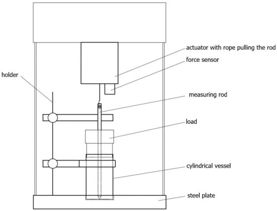 The pulled-based tester (Figure 1), consisting of a perforated, cylindrical vessel with a diameter of 24 mm, a height of 30 mm, and a mesh diameter of 1.5 mm, was used in the study. Inside the vessel, at the bottom, there is a thin cap, about 1.5 mm thick, with a centrally marked groove, enabling the measurement rods to be placed in the exact center of the sample. The measuring vessel is placed on a steel plate fixed to the device with a centering cutout. Next to the place intended for placing the measuring vessel, a holder is prepared to hold the measuring rod in a vertical position and to support the weight loading the sample. The measuring rods, made of stainless steel and polypropylene, have a height of 93.7 mm and a diameter of 4.82 mm. The rod diameter value was chosen based on similar experiments carried out with bulk materials [,,], where a 5 mm diameter penetrometer was used. The prevalence of rod materials in equipment used in food powder processing dictated the selection of rod materials. Both types of rods have the form of a cylinder with a cone-shaped lower base that allows them to be centered in the centering washers placed in the measuring vessels and a hole cut in the upper part for connection to the force sensor. From the conical base, in each type of rod, there are conical incisions parallel to the base, which reach a height of approx. 33 mm of the length of the measuring rod. For each material of rod, two rods are made with different cutting depths (h), 1.3 mm and 0.65 mm.