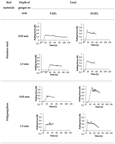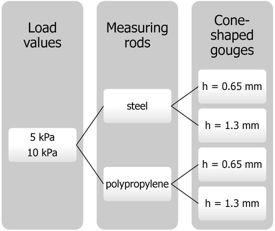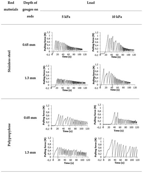 Figure 3 shows variants of the experimental tests performed for each material. The samples were examined in 10 repetitions with the use of stainless steel and polypropylene measuring rods made with two groove depths, h = 0.65 mm and h = 1.3 mm. The evolution of the force with time was plotted, and the friction between the material and rod was calculated. The maximum force obtained in the first peak was determined from the resulting waveform plots. It was next divided by lateral unit area, providing the material strength, which is considered the caking strength of powders.