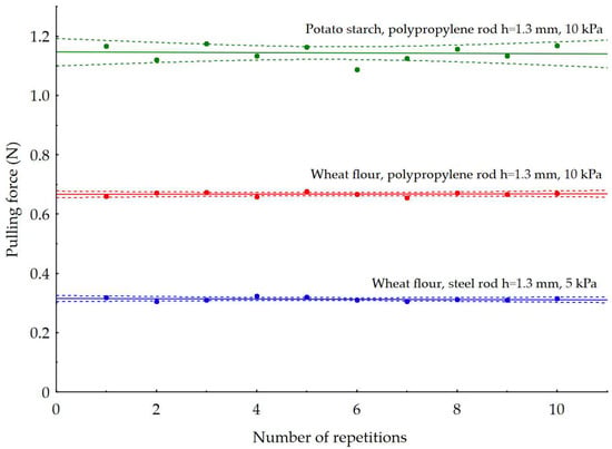 Figure 6 presents a distribution of the maximum force values recorded in ten repetitions during the pulling out of rods from powder samples. The pulling forces on steel rods with a notch depth of h = 1.3 mm from a wheat flour powder sample at a load of 5 kPa were found to be in the range of 0.3–0.33 N. In this case, the coefficient of variation in the pulling force relative to the average is 5.93%. The pulling force ranges of the polypropylene rod with notches of h = 1.3 mm depth and a load of 10 kPa from the potato starch and wheat flour samples were 1.09–1.17 N and 0.66–0.68 N, respectively, for the instances shown in the graphs. In all the cases studied, the coefficient of variation in the pulling force did not exceed 10%. An average value of the pulling force has been calculated for all repetitions, which has been then converted to caking strength.