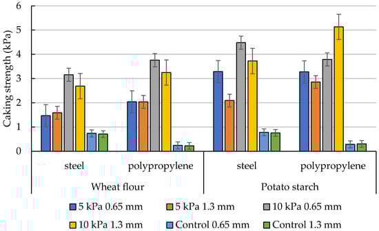 According to expectations, higher cake strengths have been obtained for samples consolidated with a maximal load of 10 kPa. It was due to the high compressibility of the material exposed to the highest force. In each measurement variant, lower values of strength have been obtained for wheat flour. It may result from the intrinsic properties of the material and its degree of compressibility. The strength of wheat flour is also determined by its morphological structure and particle size []. These results are in accordance with the results obtained by Wajs et al. [,] for the same materials subjected to the penetration test.