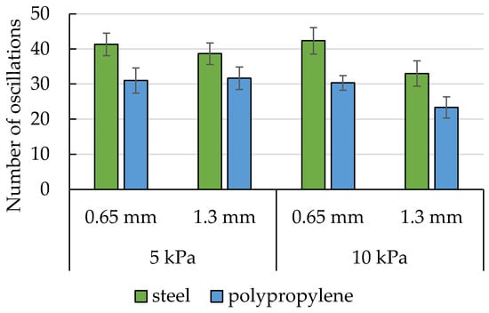 Additional analysis of the oscillations of the pulling force occurring in potato starch during measurements conducted with the pulled-based tester has been carried out. The average number of peaks (Figure 8) and their frequency (Figure 9) have been calculated within 120 s from the moment when the sensor force increased, or within a shorter time until the oscillation ceased. The rod pullout force from powders that had not been exposed to load consolidation has been used as the control test in this experiment. The force values in these samples had grown to insignificant levels before they decreased linearly. The experimental runs for the potato starch control samples have not revealed the existence of force oscillations. Therefore, the control samples are not included in Figure 8 and Figure 9.