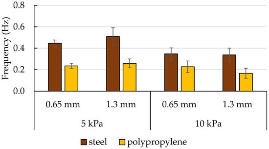Figure 9 indicates the dependence of the frequency of oscillations of force on the material of the rod. The frequency of oscillations of force measured with the polypropylene rod has been smaller. Neither the depth of the indentations nor the load consolidation have been found to affect the frequency values. The oscillations related to the slip-stick effect cause difficulties in the interpretation of results. The oscillations in force in starches and dextrins at loads of 4, 6, and 10 kPa have also been reported by Stasiak et al. []. These authors have observed that the higher the load, the earlier the slip-stick phenomenon appeared, with oscillation amplitudes reaching the order of about 3 kPa. In the work by Molenda et al. [], the oscillations resulting from the slip-stick friction have been observed in wheat flour; however, their frequency was lower than that in potato starch, and the oscillations were less regular. One of the factors affecting the frequency of oscillations with a pattern described as ‘saw tooth’, which also concerns the presented results, is a shear rate. In the common shear velocity range of approximately 1 to 2 mm/s, frequencies in the range of 1 to 10 Hz are often observed [].
