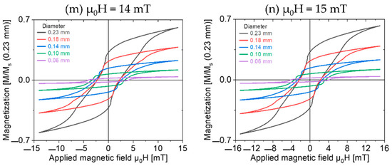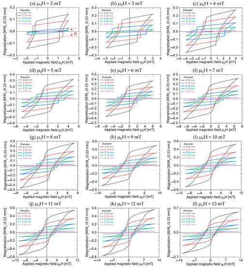 The minor loops of the Wiegand wires were measured, as shown in Figure 3. An alternating magnetic field (μ0H) from 2 to 15 mT was applied with a step size of 1 mT. The Wiegand wires were normalized to the 0.23 mm diameter Wiegand wire, where h is the height of the large Barkhausen jump.
