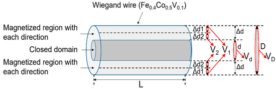 The magnetic structures of the Wiegand wires with varying diameters are shown in Figure 5. Δd1 is the thickness of the region with reversed magnetization accompanied by a large Barkhausen jump. Δd2 is the thickness of the region whose magnetization was not reversed during the large Barkhausen jump. Δd = Δd1 + Δd2, as shown in Equation (3), where d denotes the thickness of the closed domain, and D and L are the diameter and length of the Wiegand wire, respectively. V1, V2, Vd, and VD represent the volumes of Δd1, Δd2, d, and D, respectively.