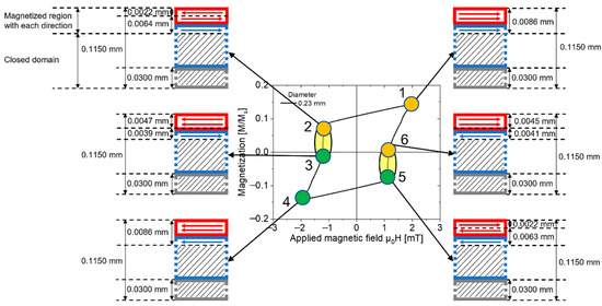 The numbers 1-6 are six points on the minor hysteresis loop. At Point 1, the thickness of the magnetized region with the right direction of the Wiegand wire was 0.0086 mm. Point 4 is symmetric to Point 1. Hence, the thickness of the magnetized region with the left direction at Point 4 was also 0.0086 mm. At Point 2, which is before the large Barkhausen jump, the surface of the Wiegand wire, whose coercivity is low, reverses during demagnetization. The thickness of the reversed volume was 0.0022 mm, and that of the unreversed volume was 0.0064 mm. At Point 3, which is after the large Barkhausen jump, the thickness of the reversed volume increased to 0.0047 mm, and that of the unreversed volume was 0.0039 mm. Point 5 and Point 6 are symmetric to Point 2 and Point 3, respectively. Thus, the magnetization process is similar, whereas the magnetization direction is the opposite.