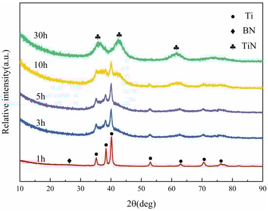 Figure 1 shows the XRD patterns of Ti and h-BN (molar ratio of Ti:BN = 3:2) mixed powders after undergoing ball milling for different time periods. After 1 h of ball milling, the h-BN diffraction peaks started to disappear significantly, while the diffraction peaks of Ti were still relatively obvious. After 3 h of ball milling, the h-BN diffraction peaks have completely disappeared, and after 10 h of ball milling, the intensity of Ti diffraction peaks has also decreased significantly, indicating that h-BN achieves solid-state amorphization easier than Ti. When the ball milling time was increased to 30 h, the XRD pattern presented with diffuse scattering peaks, representing the amorphous phase, indicative of both amorphous h-BN and Ti. However, broad peaks assigned to the TiN have been found. It seems that the composite powder did not experience phase transformation as the milling time was increased from 1 h to 10 h, but the Ti diffraction peaks shifted to smaller angles, clearly suggesting the increasing interplanar spacing, which may result from the insertion of the B and/or N atoms during high-energy ball milling. The degree of Ti lattice distortion increases gradually with the increasing milling up to 30 h, leading to the collapse of the Ti lattice, finally forming TiN. Since the initial molar ratio of the Ti:B is 3:2, it is not because the mass is too small that it is not detected. This should be accounted for by the presence of B-containing microcrystals whose size is too small to be identified using X-ray diffraction; therefore, it is necessary to observe the high-energy ball mill powder under high-resolution transmission electron microscopy to determine the degree of the powder amorphization.