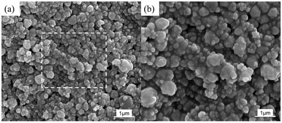 As shown in Figure 2, SEM was used to observe the morphologies and particle sizes of the as-milled Ti and h-BN mixed powders. It seems that the powders underwent an obvious hard agglomeration phenomenon due to the welding process. From Figure 2b, the size of the powder particle was around 200–500 nm. However, in HRTEM images (Figure 3), the size of the as-milled powder was about 100–200 nm. Thus, the so-called larger-sized particles were stacked through the agglomeration of smaller ones. Almost no nanocrystals appeared in the HRTEM images, suggesting the almost complete amorphization of Ti and BN mixed powders, which contrasted with the XRD results.