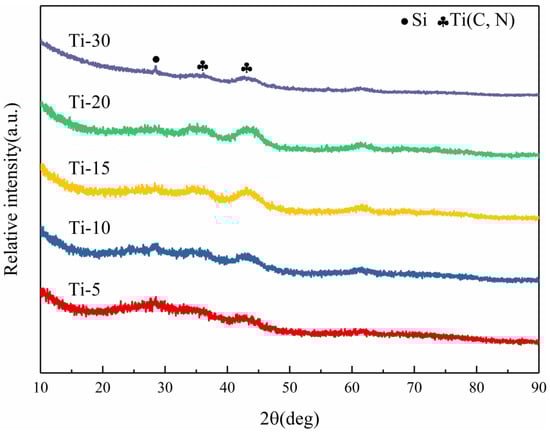 The XRD patterns of the as-milled SiBCN-Ti composite powders with different Ti contents are shown in Figure 4. For a Ti content below 30 wt.%, no trace of crystalline peaks was detected, indicating the complete destruction of the lattice structure to achieve solid-state amorphization. However, increasing the Ti content to 30 wt.% led to the emergence of new Ti(C, N) phases and Si. Actually, a few Ti(C, N) phases were also observed for SiBCN-Ti composite powders with 15 wt.% and 20 wt.% Ti addition since broad peaks assigned to Ti(C, N) appeared. With the increase in Ti introduction, the Ti(C, N) diffraction peak gradually enhanced. In the case of 30 wt.% Ti-addition, the appearance of a Si peak should be argued to be due to the inhibited amorphization process of Si; however, the detailed reasons for this unexpected result are still in their infancy.
