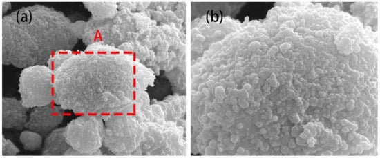 SEM images of SiBCN-15 wt.% Ti composite powders after mechanical alloying for 20 h: (a) low magnification; (b) high magnification of the red dashed area A in the (a).
