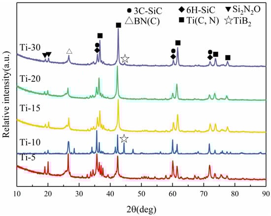 The phase composition of the as-sintered SiBCN-Ti bulk ceramics is shown in Figure 7. Obviously, the amorphous phases have crystallized into nanostructures, including the main phases of BN(C), SiC, and Ti(C, N), and the minority of Si2N2O and TiB2. Naturally, the diffraction peaks of the Ti(C, N) phases gradually enhanced with the increase in Ti content.