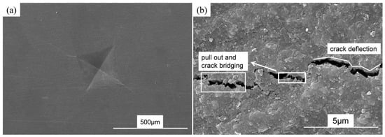 SEM microcrack morphologies of SiBCN-15 wt.% Ti bulk ceramics: (a) Indentation morphology; (b) microcracks deflection and bridging.