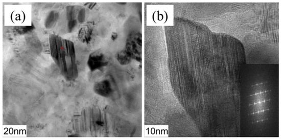 As shown in Figure 11, substantial bright and dark streaks, indicative of stacking faults, were found to be distributed in some SiC grains. Furthermore, EDS analysis suggested the limited solution of some B, N, and Ti atoms in SiC, as shown in Table 2. Apparently, due to the limited solution of external atoms, the SiC lattice has been distorted irregularly [31].