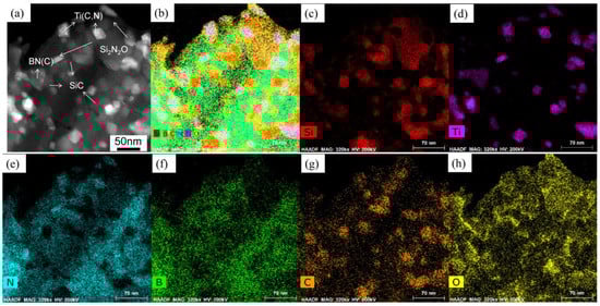 To have a more accurate understanding of the detailed structure information, the Si, B, C, N, Ti, and O element mappings are exhibited in Figure 12. As indicated, the B and N elements were almost distributed in the same position. Some C elements were distributed in the B and N, but their distribution was relatively more concentrated in the Si-enriched area. Additionally, Ti elements were distributed in B, C and N regions but were more in C- and N-enriched regions and less in B-enriched regions. The O mapping almost overlapped with N and Si mappings, suggesting the distribution of Si2N2O in the ceramic matrix.
