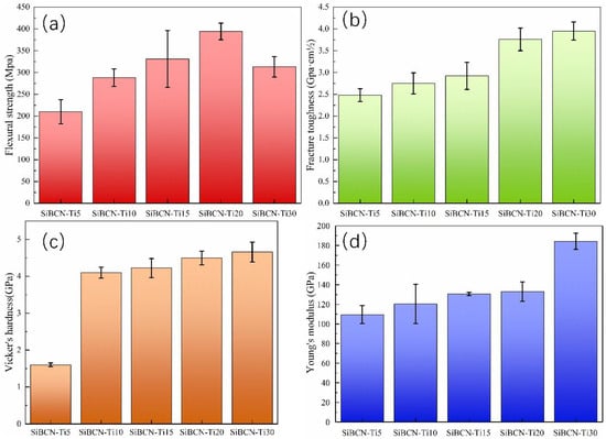 Mechanical properties of as-sintered SiBCN-Ti bulk ceramics: (a) flexural strength; (b) fracture toughness; (c) Vickers hardness (d) Young’s modulus.