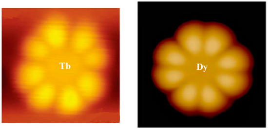 STM images in experiments. (Left): TbPc2, bars indicate 1 nm; (Right): DyPc2,image sizes: 3 × 3 nm2 [16,17].