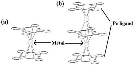 Structures of (a) double- decker metal Pcs, consisting of a metal ion sandwiched between two Pc ligands and (b) triple-decker metal Pcs, metal ions are stacked between sandwich-type Pc oligomers [30].