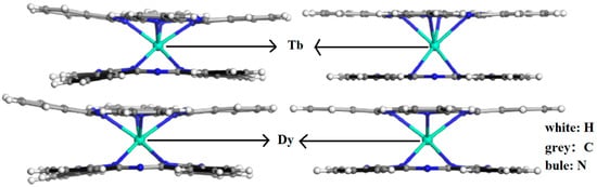 To date, more than one hundred Ln-SMMs have been discovered and studied. Owing to their excellent physical properties, Ln-Pcs (Ln = Tb, Dy) are widely favored by researchers [33,34,35,36,37]. The model of Ln-Pcs is shown in Figure 3a,b, the Ln3+ (Ln = Tb, Dy) ion is located in the center of the molecule with two parallel Pc rings to form a sandwich structure molecule. The double-decker Ln-Pcs (Ln = Tb, Dy) has D4d symmetry [33,34,38]. DyPc2 is similar in properties to TbPc2, which possesses an anisotropic Ueff of 410 cm−1 and a spin-orbit coupling quantum number of J = 6 [39].