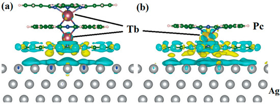 Calculated charge transfer between (a) Tb2Pc3 and (b) TbPc2 molecules and the Ag(111) surface obtained from DFT calculations. It used exchange correlation functional PBE + U with U = 5 eV for f-electrons of Tb and van der Waals interaction was approximated by the Tkatchenko-Scheffler dispersion correction method. The yellow and blue colors represent the accumulation and loss of density, respectively. The presence of blue density on the upper surface layer indicates substantial charge transfer from the metallic surface toward the molecule [34].