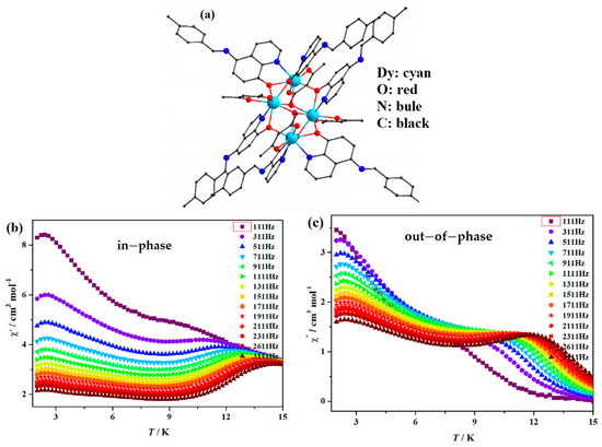 In 2020, Wang et al. reported the synthesis of [Ln4(acac)4(μ2-L)6(μ3-OH)2]·2C2H5OH (Ln = Tb and Dy). Its structure is shown in Figure 6a. They found that significant slow magnetic relaxation behavior occurred for [Dy4(acac)4(μ2-L)6(μ3-OH)2]·2C2H5OH with an anisotropic barrier of 82.1 K, as shown in Figure 6b,c [51]. For [Dy4(acac)4(μ2-L)6(μ3-OH)2]·2C2H5OH, below 15 K, both in-phase and out-of-phase become frequency dependent, and two distinct peaks for the out-of-phase ac signals are evident during the frequency range 311–3111 Hz, indicating the possible multiple relaxation processes existing in it.