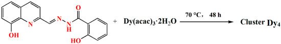 A new Dy4 cluster based on a polydentate Schiff base ligand was reported by Shi et al. [53]. They found that the Dy4 cluster has obvious SMM behavior. Figure 7 displays the synthesis steps of the Dy4 cluster: Dy(acac)3·2H2O, H3L, CH3OH, CH3CN and CH2Cl2 were enclosed in a glass vial and heated to 70 °C for about 48 h. Then it was dropped to room temperature at a rate of about 5 °C/h, and the crystals Dy4 cluster was obtained.