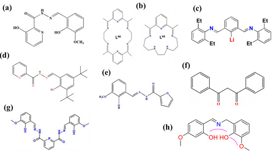 The structure of the Schiff base ligand (a) H3L [54]. (b) LN5 and LN6 [55]. (c) LiL2 [56]. (d) H2L [57]. (e) HL [58]. (f) Hdbm [59]. (g) H4Bmshp [60]. (h) H2hmp [61].