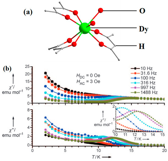 The schematic image: (a) Model of [Dy(acac)3(H2O)2]. (b) The relationship curves of temperature and ac susceptibility at frequencies from 10 to 1488 Hz for the undiluted Dy compound. Dy green, H atoms and solvent molecules or ligands are omitted [69].