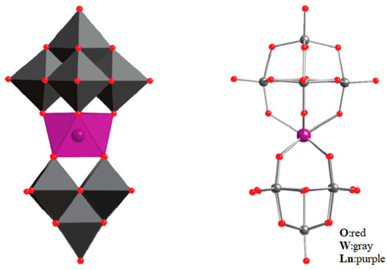 The schematic image:model of [Ln(W5O18)2]9−. The left is the polyhedral type, and the right is the ball-and-stick type [71].