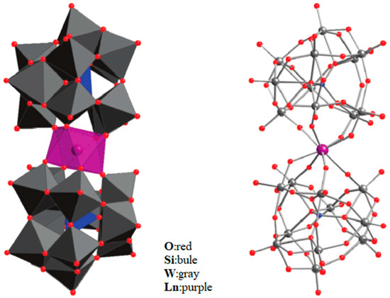 The schematic image: model of [Ln(β2-SiW11O39)2]13−. The left is the polyhedral type, and the right is the ball-and-stick type [72].