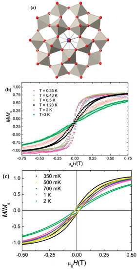 The schematic image: (a) Model of [LnP5W30O110]12−. (b) Hysteresis curves for DyW30. (c) Magnetization hysteresis loops of HoW30 [73].